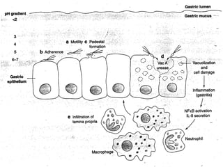 Helicobacter pylori è un batterio gram-negativo microaerofilo associato a gastrite cronica, ulcere peptiche e adenocarcinomi. Presenta diversi fattori di virulenza, tra cui l'ureasi, che neutralizza l'acido gastrico e consente la colonizzazione. Attualmente non esiste un farmaco ideale per l'eradicazione, ma si utilizzano combinazioni di antibiotici e inibitori della pompa protonica.
