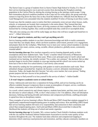 Service learning provides students with opportunities to apply classroom knowledge to help address real community issues. When implemented with quality standards, research shows service learning can improve academic achievement, civic engagement, and character development. It benefits students both during and after school by developing skills valued by colleges and employers such as collaboration, communication, problem solving, and leadership. Service learning allows all students, including those from disadvantaged backgrounds, to build confidence and contribute value through meaningful service.