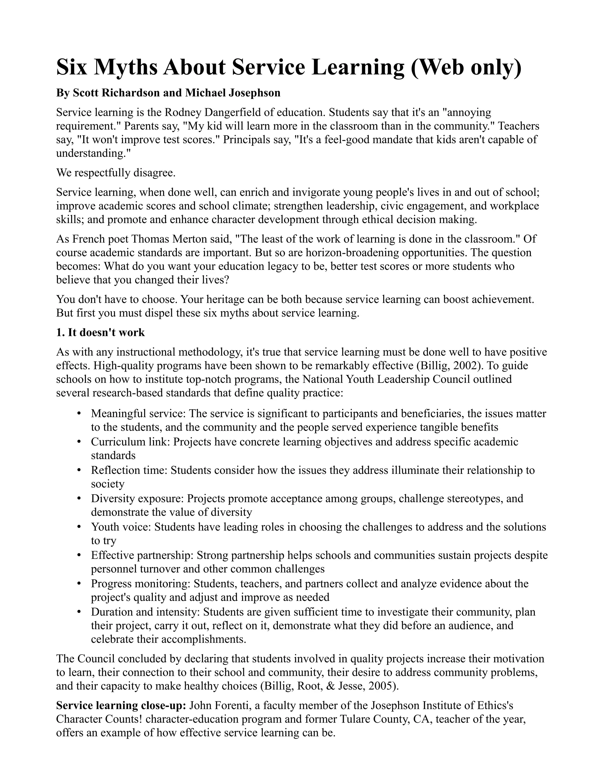 Service learning provides students with opportunities to apply classroom knowledge to help address real community issues. When implemented with quality standards, it has been shown to improve academic achievement, civic engagement, and character development. It benefits students both during and after their school years by developing skills valued by colleges and employers such as collaboration, communication, problem solving, and leadership. Service learning allows all students, regardless of background, to find purpose and make meaningful contributions that boost self-esteem and motivation to learn.