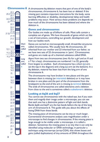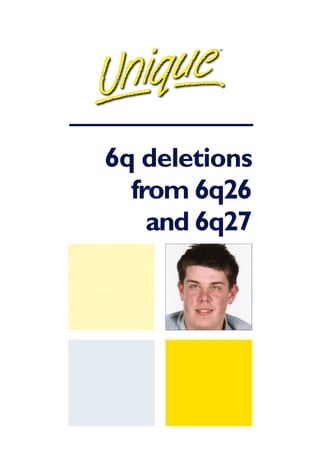 This document summarizes information about chromosome 6q deletions, specifically deletions from bands 6q26 and 6q27. It describes: