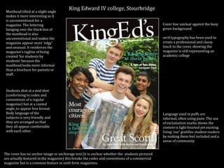 1) King Edward IV college magazine uses an unconventionally tilted masthead and hanging lettering to seem more informal for a student-created magazine. Photos are at a canted angle to appear less formal as well.