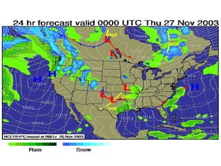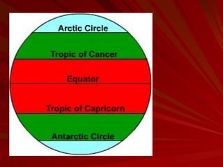 This document summarizes key concepts about weather and climate. It discusses different weather factors like temperature, wind, humidity and how they are measured. It describes different cloud types and how weather patterns form due to air mass movements. It also explains severe weather events like tornadoes and hurricanes. Finally, it discusses climate zones and how climates can change over time due to various natural and human-caused factors like the greenhouse effect and global warming.