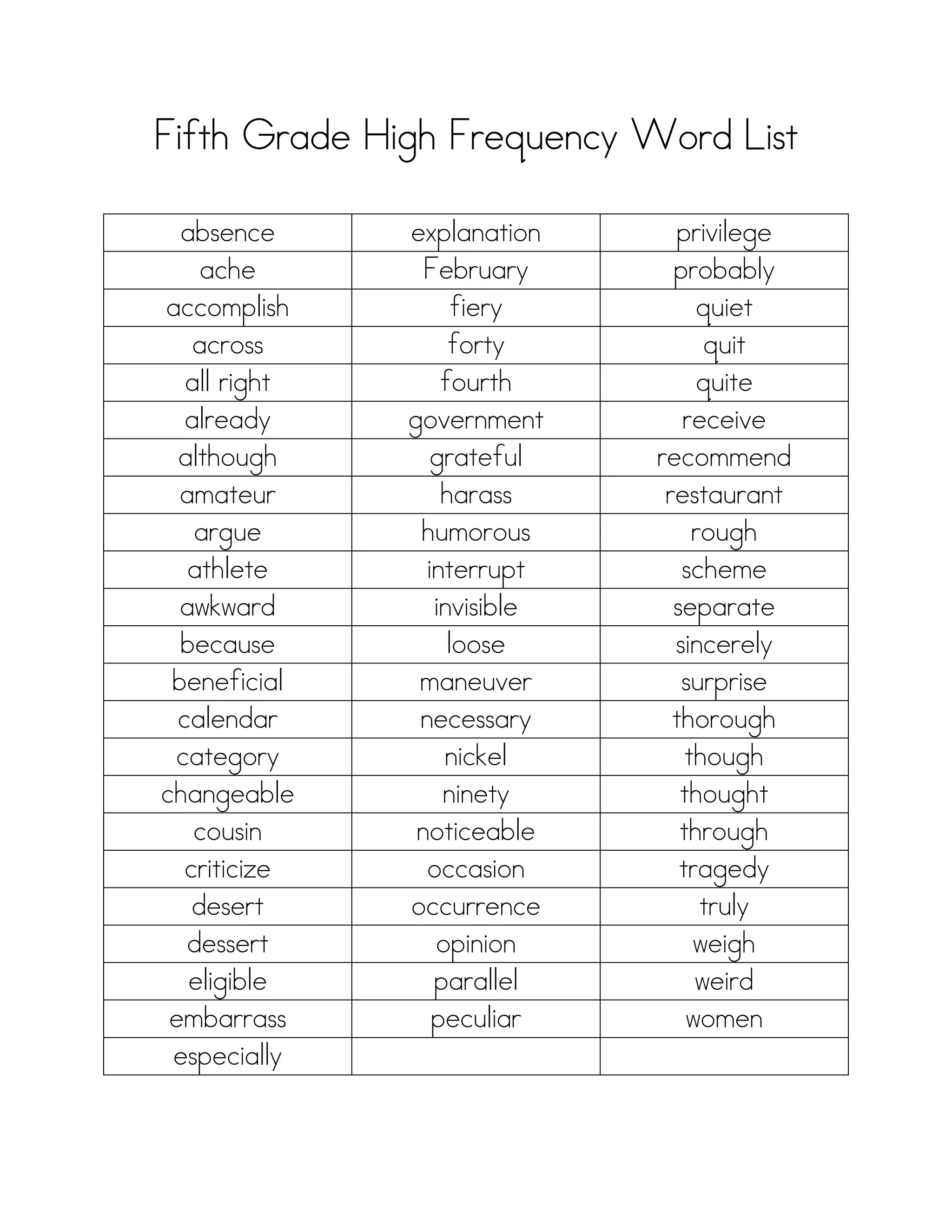 This document contains a list of high frequency words that fifth grade students should know. It includes over 100 words ranging from short and common words like "all" and "right" to longer and less common words like "embarrass", "occurrence", and "necessary". Mastering these words will help fifth graders in their reading and writing skills.