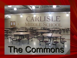 Carlisle Middle School welcomes new students and provides an overview of the school layout and programs. The commons area is the central location for breakfast, lunch, and between class time. Administrative offices and the media center are located there. Each grade has its own wing with classrooms, computer labs, and lockers. Core classes meet daily while exploratory classes like art, PE, and life skills meet on rotating schedules. Students have choices for hot lunch or a la carte items. After school activities include band, choir, clubs, and sports. The school recognizes positive behavior through rewards and celebrations.