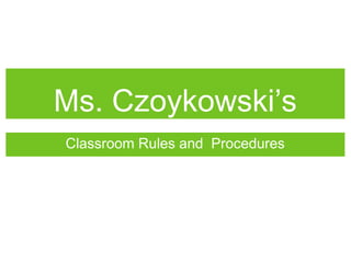 Ms. Czoykowski's classroom rules require students to be respectful, prepared, and active participants. Minor offenses will result in verbal warnings, while more serious offenses are immediately recorded. Assignments are graded using a point system, with no extra credit or late work accepted. Homework is due daily and absences require work to be made up within the number of days missed. Students must follow beginning and end of day procedures, including jobs, bell work, and clean up. Technology use policies and grading policies are also outlined.