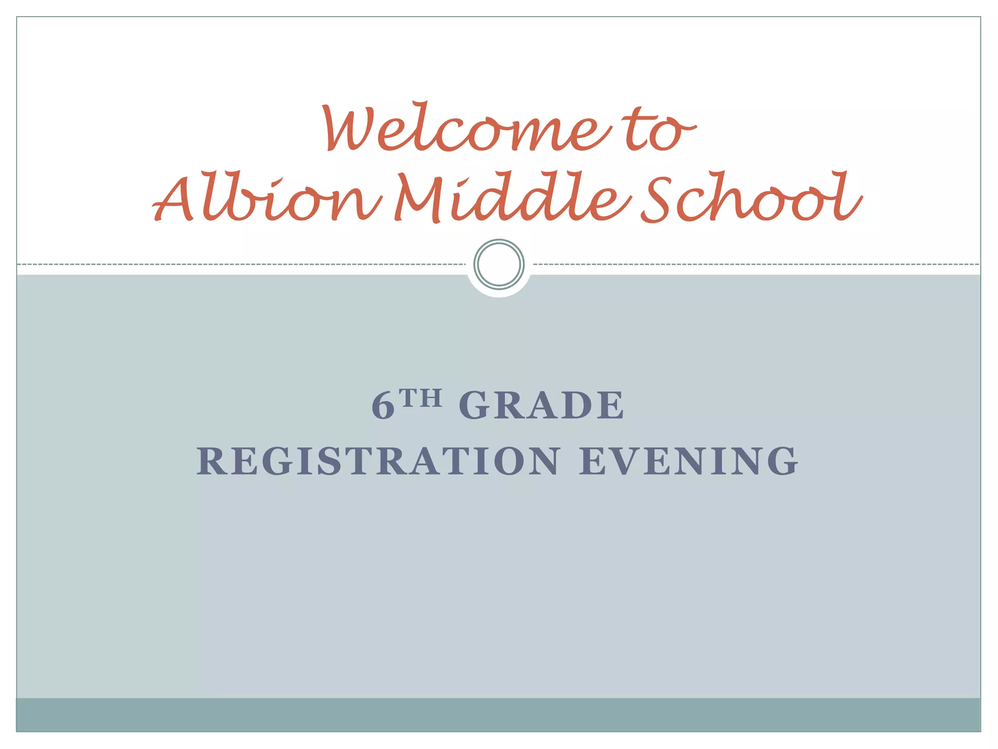 The document provides information about Albion Middle School's 6th grade registration evening. It introduces administrators and counselors and describes the school schedule, teaming structure, and required core classes. It discusses elective options like band, choir, art, Spanish, and keyboarding, and encourages students to choose electives wisely as schedules will not be changed. The registration packet and process is also outlined.