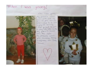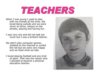 The document describes the childhood experiences of three teachers. The first teacher enjoyed playing outside with friends and sports, which led them to become a physical education teacher. The second teacher was very energetic and talkative as a child and enjoyed basketball and traveling, motivating them to become a language teacher. The third teacher was shy but liked playing with friends and spending summers in their village, carrying a doll named Mary, and they became a teacher.