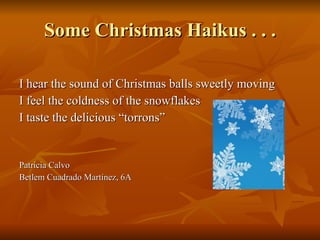 The document discusses Christmas preparations at a school. The 6th grade class is writing cards, singing carols, and decorating classrooms for Christmas. It also includes three haikus about Christmas from students in class 6A, describing the sounds of Christmas balls, cold snowflakes, and tasty torrons; a roast turkey, falling snow, and presents under the tree; and singing carols, surprising presents, and eating torrons and neules.