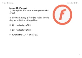 The document outlines assignments and lessons from a math notebook. It lists that assignment 26 is due on Tuesday November 6th and test 4 is on Friday November 9th. It then provides warm up questions on fractions and factors. The lesson explains that division can be written as mixed numbers with whole numbers and fractions. It also defines multiples as products of counting numbers and other numbers, and provides examples of dividing fractions.