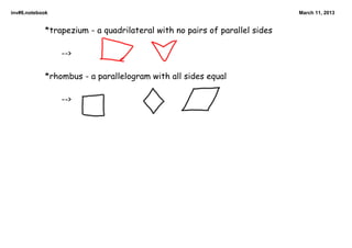 This document defines and classifies different types of quadrilaterals: a parallelogram has two pairs of parallel sides, a trapezoid has one pair of parallel sides, a trapezium has no parallel sides, and a rhombus is a parallelogram where all sides are equal.