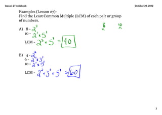 The document discusses finding the least common multiple (LCM) of numbers using prime factorizations. It provides examples of finding the LCM of various number pairs and groups by writing out their prime factorizations, identifying the largest common exponent for each prime factor, and multiplying the prime factors with those exponents. The document also provides tips for mentally calculating quotients by doubling numbers instead of dividing fractions.