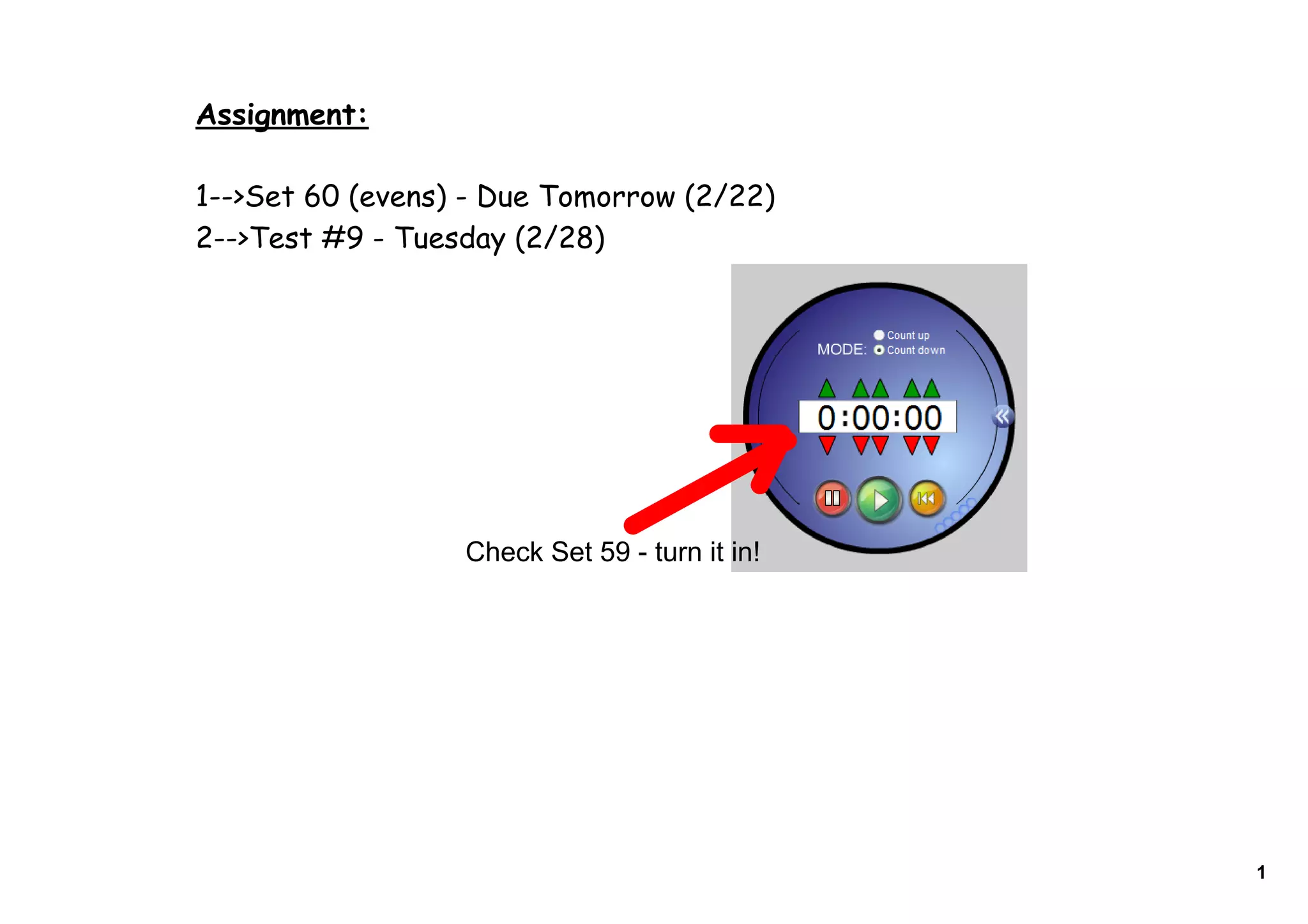 1) An assignment is due tomorrow requiring students to complete Set 60 (even problems) and a Test #9 is scheduled for the following Tuesday. 2) Lesson 60 reviews how to solve fractional part problems by setting up equations, with examples such as finding 4/5 of 71, 0.75 of 14.4, 30% of 150, 3% of $39, 25% of 64, a 12% commission on $250,000 in sales, and calculating sales tax on a $36.89 item at a 7% rate. 3) Students are reminded to turn in their completed Set 59.