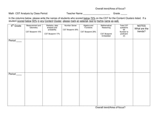 The document is a template for a teacher to analyze student performance on the California Standards Test (CST) in math by class period. It includes spaces for the teacher to write the names of students who scored below 70% or 50% on different content areas of the test. It also has sections for the teacher to note trends in student performance by class period and content area, and to compare scores of English learner students to overall group averages.