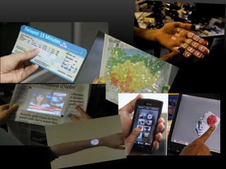 Sixth sense technology allows users to interact with the digital world through hand gestures by projecting information onto surfaces. Pranav Mistry developed this concept, allowing users to make calls, take photos, and access information with hand gestures alone. Samsung has adopted this technology for their Galaxy Gear smartwatch, which can perform tasks like making calls, checking emails, and capturing photos through intuitive gestures and a simple interface.