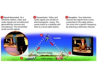 4. For radios, an audio signal is combined with a carrier wave and transmitted via electromagnetic waves to antennas. The radio separates the signal from the carrier wave. For TV, video and audio signals