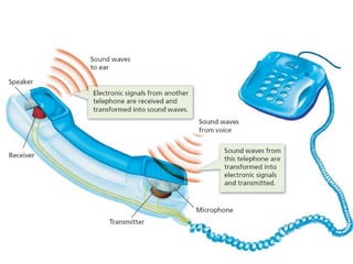 2. During a phone call, sound waves cause a metal disk in the transmitter to vibrate, transforming sound into an electronic signal. The receiver uses a speaker to transform the electronic signal back into sound.