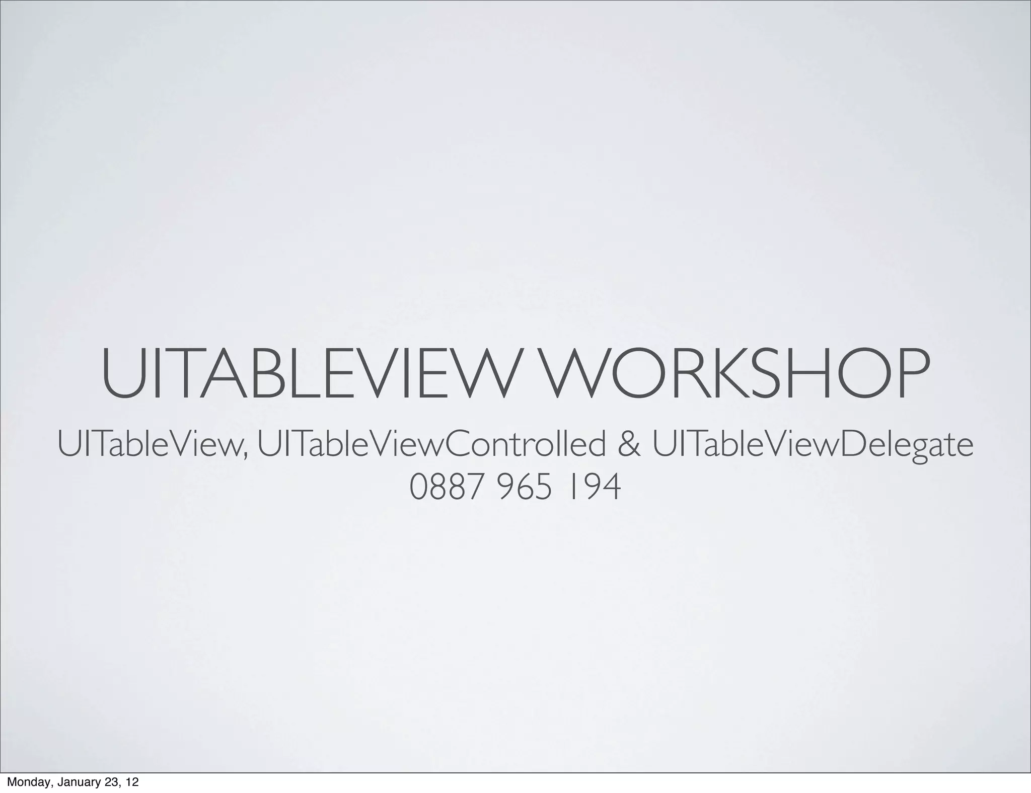 The document is about a UITableView workshop that discusses UITableViews, UITableViewControllers, and UITableViewDelegates. It covers the basics of UITableViews including why to use them, the main concepts, types of table views like standard, grouped, and indexed lists. It also discusses cell formats, section headers and footers, and gives examples of different cell styles.