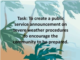 This document provides instructions for a Spanish writing assignment to create a public service announcement about severe weather preparedness. Students are to review vocabulary related to weather and supplies, think of verbs to encourage preparedness, and fill out a graphic organizer with this information. They will then use the vocabulary and organizer to write sentences for the announcement, keeping the language simple and using only vocabulary from the lesson. The finished announcement should educate the community and be creatively designed.