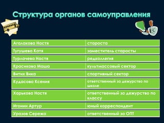 Документ описывает класс 7в гимназии за 2011/2012 учебный год, включая информацию о классном руководителе, старосте и активистах класса. Описаны достижения учащихся, такие как участие в олимпиадах, творческих конкурсах и хобби, подчеркивающиеся их личные качества. Класс имеет 22 ученика и выражает командный дух через девиз и правила взаимодействия.