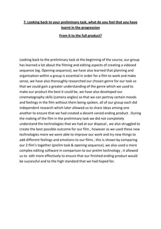 From the preliminary task to completing the full product, the group learned about filming, editing, and creating a cohesive video sequence. They gained important insights around planning, research, and developing camera and cinematography skills to convey mood through visuals rather than words. Working with new technologies throughout the process helped them improve their skills and try new techniques to add depth of feeling to their films.