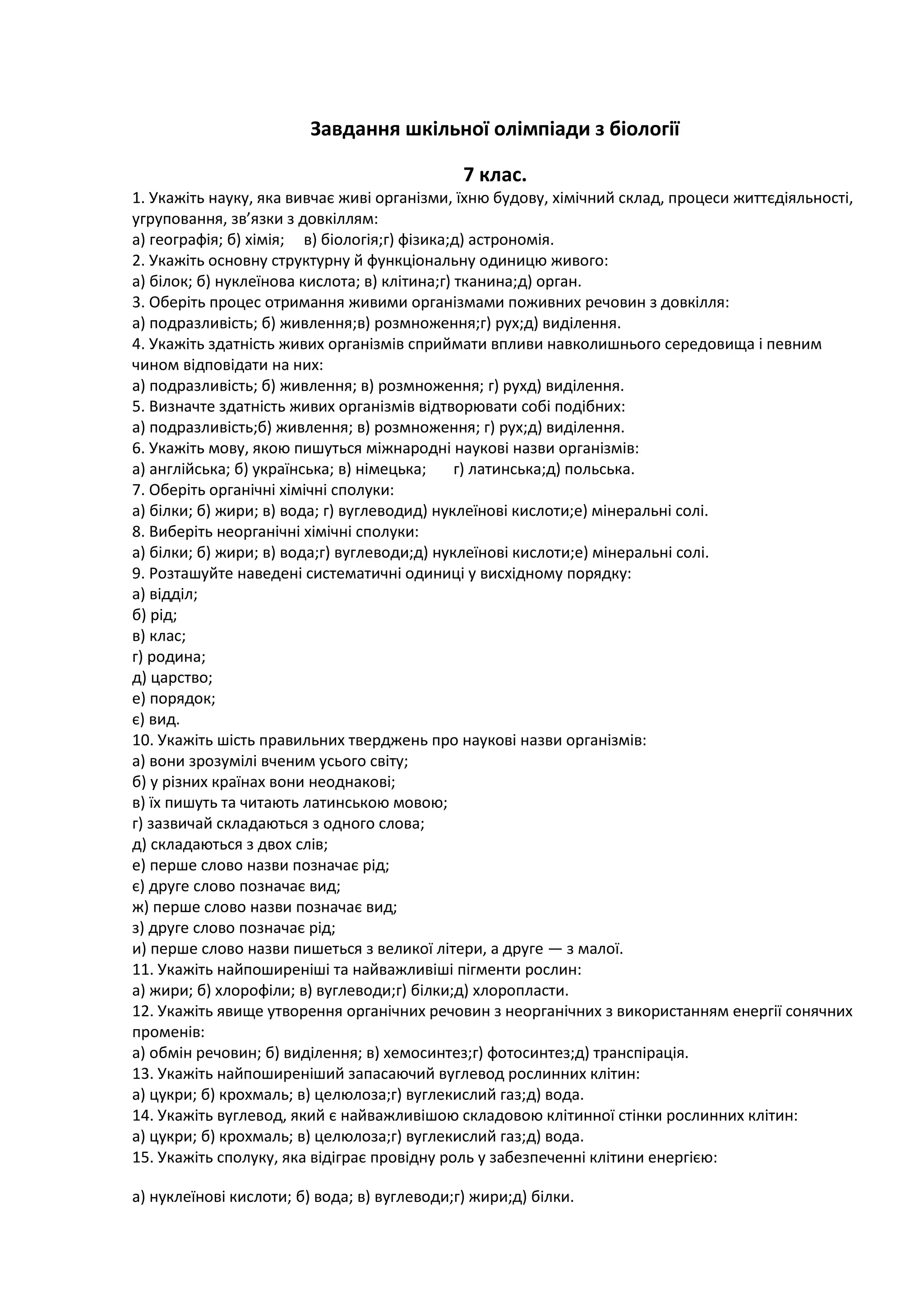 1. Укажіть науку, яка вивчає живі організми, їхню будову, хімічний склад, процеси життєдіяльності,