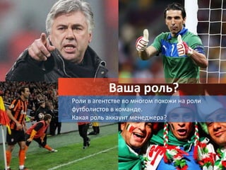 Документ описывает важные качества, необходимые аккаунт-менеджерам в интернет-агентствах, сравнивая их роли с футболистами в команде. Аккаунт-менеджер обеспечивает реализацию целей клиента, используя различные инструменты рекламы, и отвечает за их результаты. Также подчеркивается необходимость предугадывания проблем и постоянного контроля за проектом для успешной работы с клиентами.