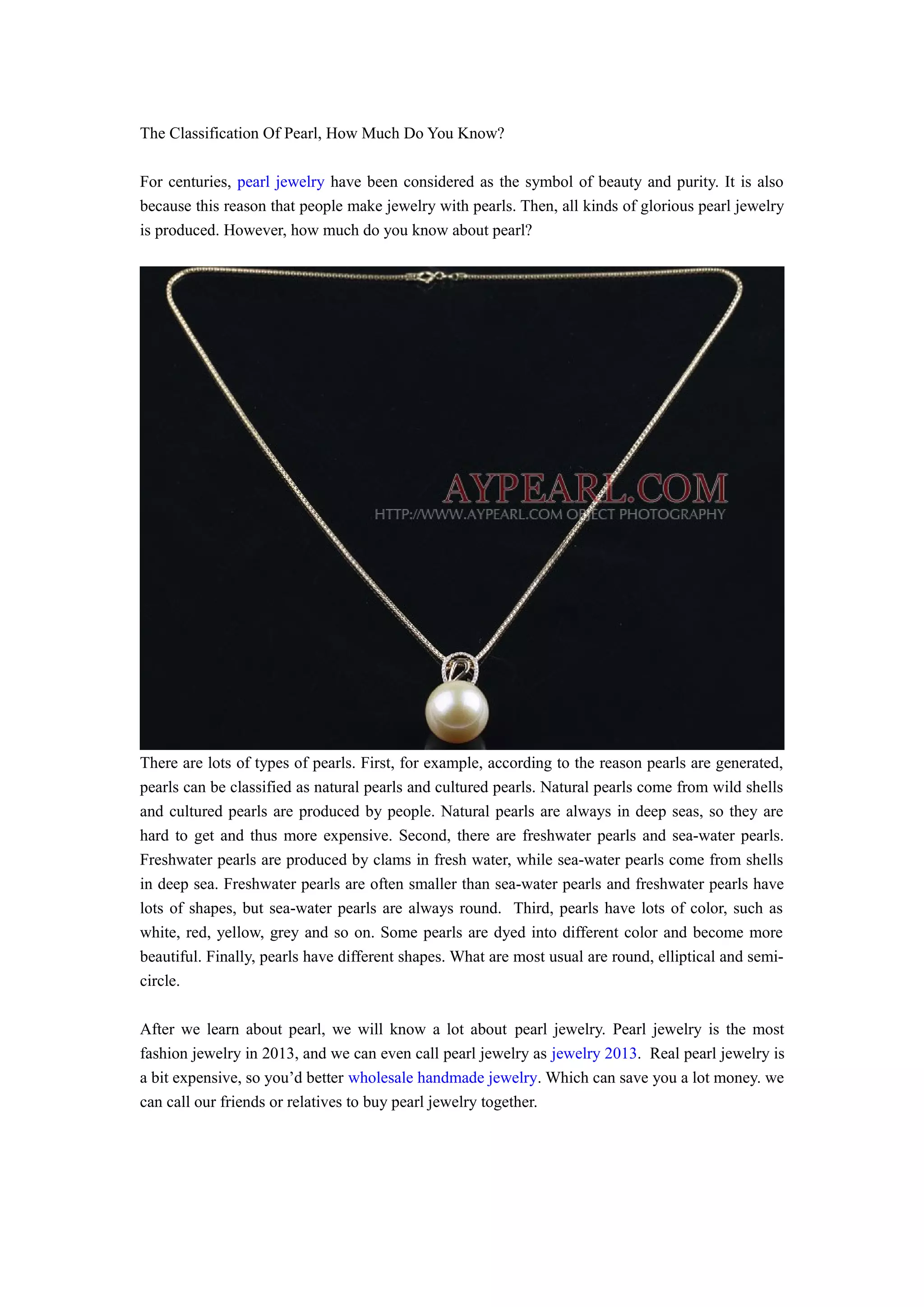 Pearls can be classified into several types based on their origin and characteristics. Natural pearls form inside oyster shells in the ocean, while cultured pearls are formed when a nucleus is inserted by humans. Pearls also differ based on whether they come from freshwater or saltwater sources, and they can have various colors and shapes. Pearl jewelry has become very popular fashion items in recent years. While real pearl jewelry can be expensive, wholesale handmade pearl jewelry offers a more affordable option. The document recommends buying pearl jewelry in groups to save money and introduces the jewelry supplier Aypearl.com.