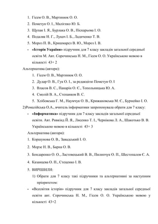 1) Горбова О. А., вчитель історії, запропонувала обрати для 7 класу: