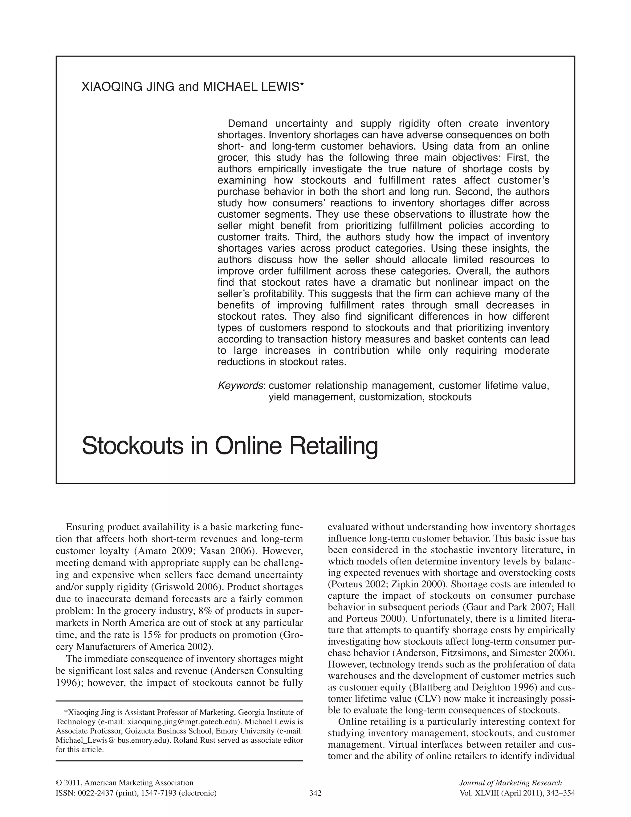 This study examines how inventory shortages or stockouts affect customer purchase behavior and a retailer's profitability using data from an online grocer. The three main objectives are: