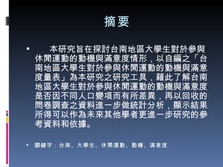 本研究旨在探討台南地區大學生參與休閒運動的動機與滿意度,根據自編的量表進行調查分析。研究將考量不同人口變項對動機與滿意度的影響,並為未來相關研究提供參考資料。文中涉及的問題和假設將幫助確定大學生參與休閒運動的原因以及其與滿意度的相關性。