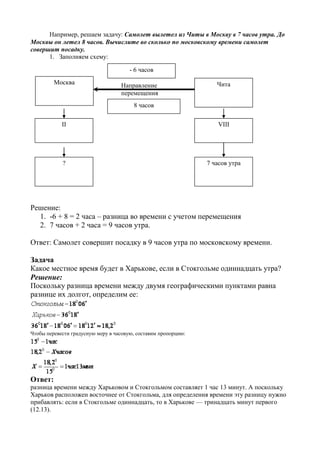Документ подробно объясняет концепцию часовых поясов, описывая количество и ширину поясов, а также основной меридиан каждого из них. Приводятся примеры расчета времени между разными городами, такими как Чита и Москва, а также Стокгольм и Харьков. Обратите внимание на практическое применение знаний о часовых поясах для решения задач по времени.