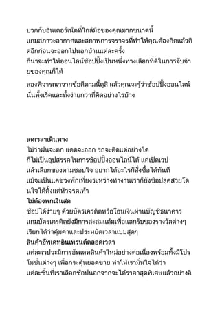This document lists popular online shopping websites in Thailand such as www.zalora.co.th, www.tarad.com, and www.wearyouwant.com that offer clothing, accessories, and beauty products. It also mentions international websites for online shopping like www.net-aporter.com and www.amazon.com. Finally, it provides a customer service phone number and operating hours from 9:30am to 5:30pm from Monday to Friday.