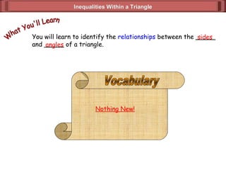 The document discusses inequalities between sides and angles of triangles. It states that if the measures of the sides of a triangle are unequal, then the measures of the angles opposite those sides are unequal in the same order (Theorem 7-6). Similarly, if the measures of the angles of a triangle are unequal, then the measures of the sides opposite those angles are unequal in the same order (Theorem 7-7). It also discusses the triangle inequality theorem, which states that the sum of the measures of any two sides of a triangle is greater than the measure of the third side.