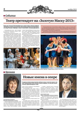 Екатеринбургский государственный академический театр оперы и балета был номинирован на 13 наград национальной театральной премии «Золотая маска» 2013 года, включая две постановки: оперу «Граф Ори» и балет «Amore Buffo». В этом сезоне театра дебютировали новые солисты, такие как Александр Краснов и Артем Голубев, которые показывают высокий уровень мастерства, а также важные достижения артистов, включая победы на международных конкурсах. Театр также готовит рождественские концерты и отмечает 100-летие с грандиозным гала-представлением.