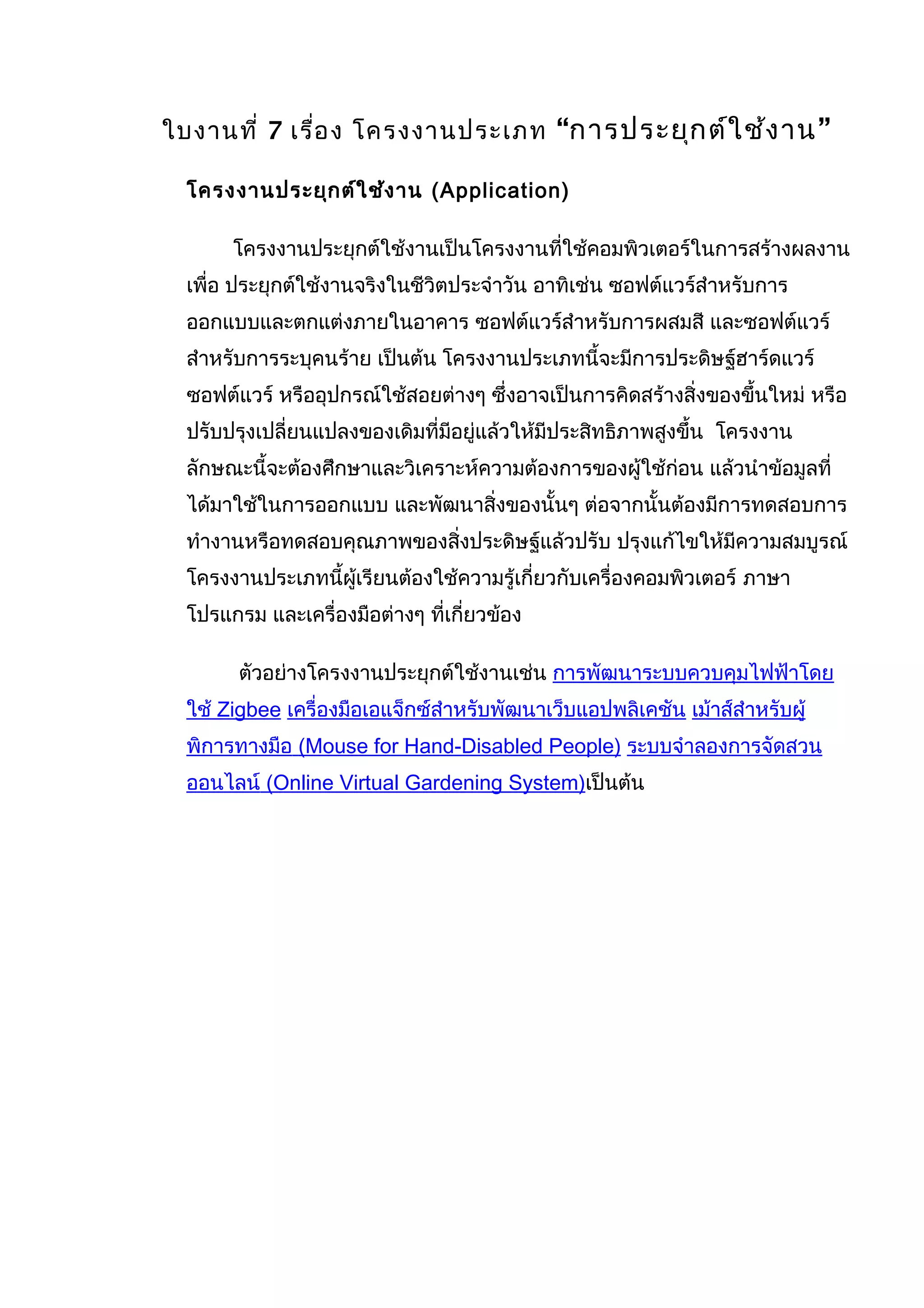 ใบงานที่ 7 เรื่องโครงงานประเภท “การประยุกต์ใช้งาน”