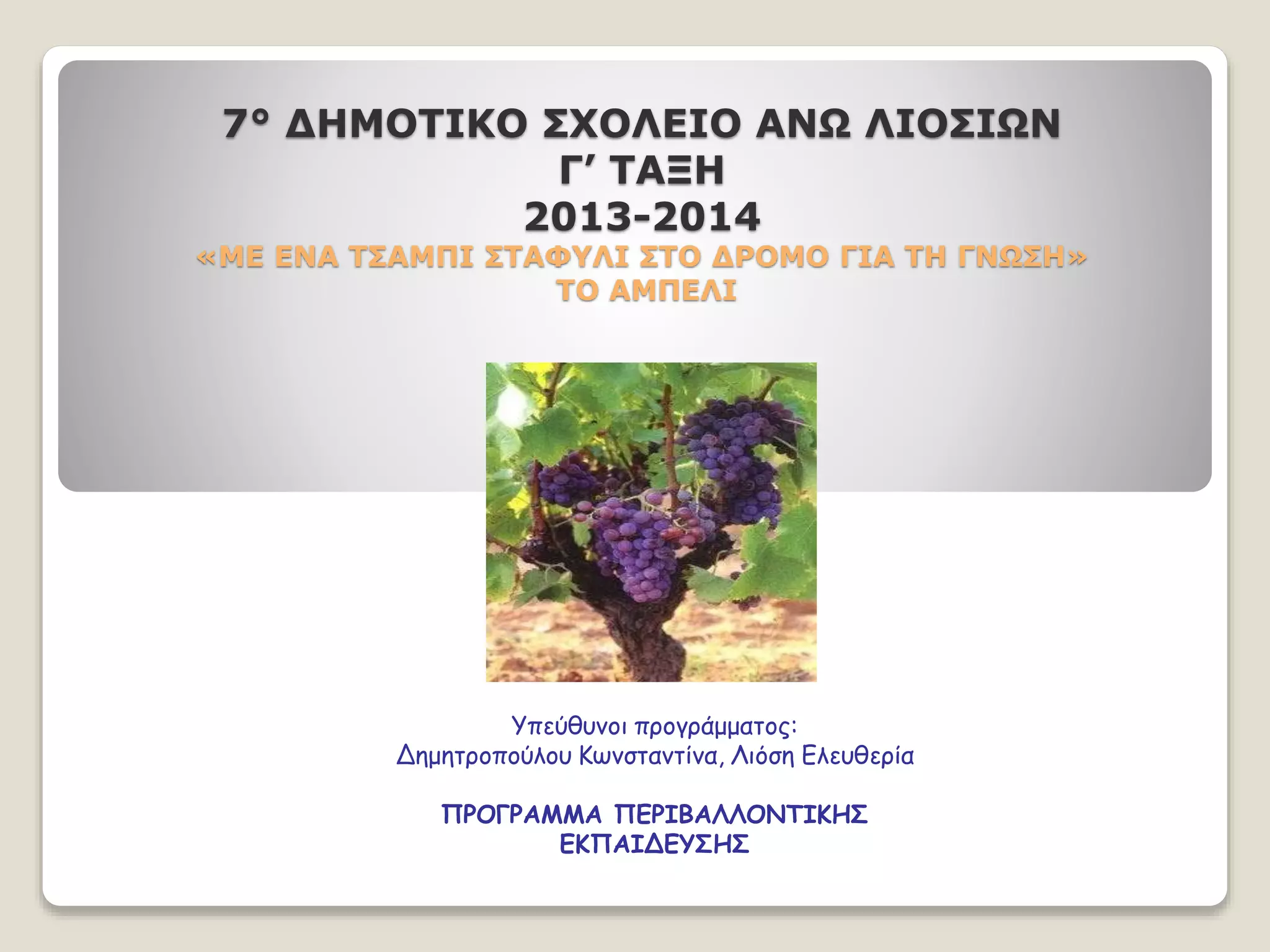 Περιβαλλοντικό πρόγραμμα υλοποιημένο τη σχολική χρονιά 2013-2014 από τις Γ΄ τάξεις με υπεύθυνες εκπαιδευτικούς την Κωνσταντίνα Δημητροπούλου και Ελευθερία Λιόση.