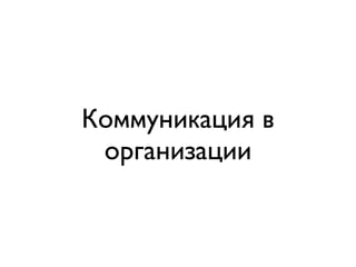 Документ рассматривает процесс коммуникации в организации, его виды и важность для взаимодействия между сотрудниками и руководством. Описываются преимущества и недостатки различных каналов коммуникации (сверху-вниз, снизу-вверх, горизонтальные), а также влияние невербальных сигналов на понимание сообщений. Кроме того, упоминаются способы преодоления коммуникационных барьеров и необходимость адаптации организационной структуры для улучшения коммуникации.