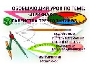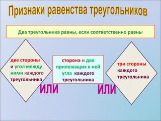 Документ рассматривает условия равенства треугольников, указывая на важные признаки: равенство одной стороне и двух прилежащих углов, две стороны и угол между ними, а также три стороны каждого треугольника. Приведено утверждение о равенстве треугольников ∆ аво и ∆ соd при данных стороне ао и ос. Также указаны использованные источники литературы и интернет-ресурсы для подготовки урока по геометрии.