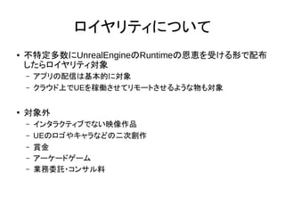 クラウド上でUEを稼働させてリモートさせるような物も対象 ● 対象外 – インタラクティブでない映像作品 – UEのロゴやキャラなどの二次創作 – 賞金 – アーケードゲーム – 業務委託・コンサル料