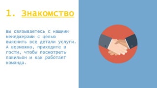 Документ описывает процесс создания личной видео презентации в 7 этапов, начиная с знакомства и обсуждения деталей услуги и заканчивая получением готового продукта. Включены такие шаги, как бриф, сценарная доработка, установка речевика, съемка, монтаж и финализация. Каждый этап охватывает ключевые аспекты, необходимые для создания эффективной видео презентации.