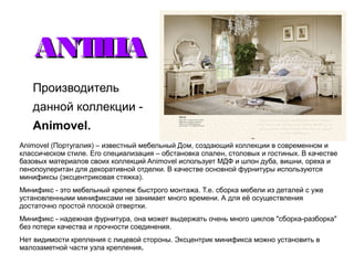 Документ представляет производителя animovel, специализирующегося на мебели в современном и классическом стилях, начиная с 1958 года. В использовании находятся высококачественные материалы, такие как MDF и шпон различных древесных пород, а также уникальные крепежные системы минификс для удобства сборки. Мебель animovel востребована как в Португалии, так и за её пределами, и отличается элегантным дизайном, разнообразием покрытий и цветовой палитрой.