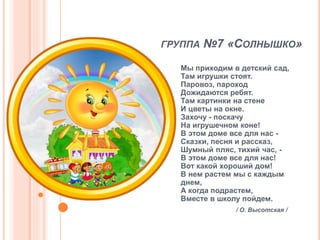 Документ описывает повседневную жизнь детей в детском саду группы №7 'Солнышко', включая игры, порядок и заботу о природе. Упоминаются разные уголки в группе, такие как раздевалка, аквариум и зеленый уголок с растениями. Также акцентируется внимание на важности чистоты и организации, а также на обучении детей через игру и изучение окружающего мира.