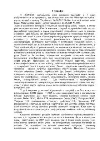 У 2015/2016 навчальномуроці вивчення географії у 7 класі