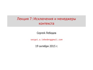 Документ посвящен исключениям и менеджерам контекста в Python. Он описывает использование конструкции try...except для обработки ошибок, типы встроенных исключений, механизм обработки исключений и назначение менеджеров контекста для управления ресурсами. Также рассматриваются примеры и применение специальных методов для работы с исключениями и контекстными менеджерами.