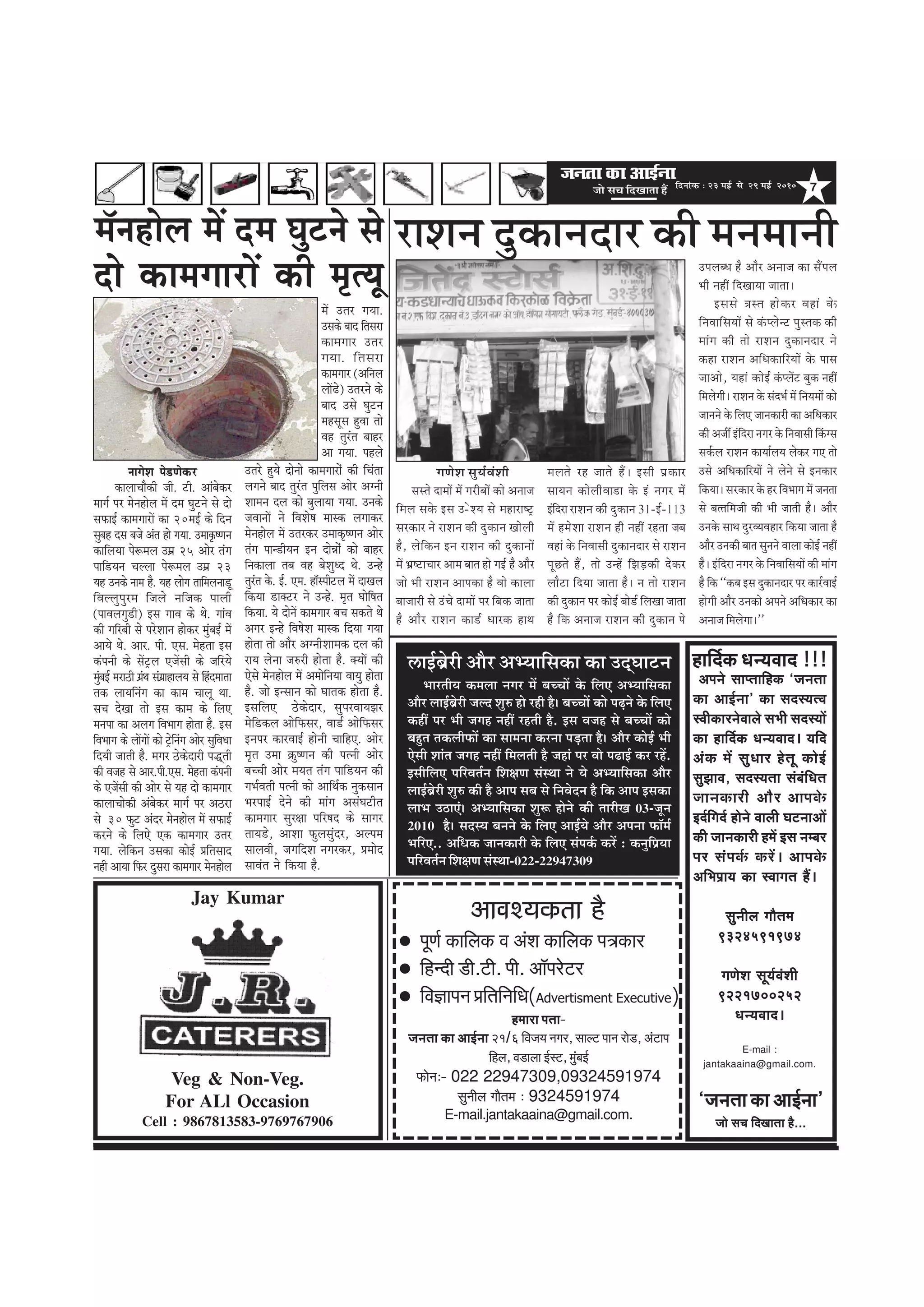 me®e efoKeelee nQ efoveebkeÀ ë 23 ceF& mess 29 ceF& 2010 7 hetCe& keÀeefuekeÀ Je DebMe keÀeefuekeÀ he$ekeÀej efnvoer [er.ìer. Heer. Dee@Hejsìj efJe%eeHeve ÒeefleefveefOe(Advertisment Executive) nceeje Helee- pevelee keÀe DeeF&vee 21/6 efJepe³e veiej, meeuì Heeve jes[, DebìeHe efnue, Je[euee F&mì, cegbyeF& HeÀesveë- 022 22947309,09324591974 megveerue ieewlece ë 9324591974 E-mail.jantakaaina@gmail.com. DeeJeM³ekeÀlee nw DeHeves meeHleeefnkeÀ `pevelee keÀe DeeF&vee' keÀe meom³elJe mJeerkeÀejvesJeeues meYeer meom³eeW keÀe neefo&keÀ Oev³eJeeo~ ³eefo DebkeÀ ceW megOeej nslet keÀesF& megPeeJe, meom³elee mebyebefOele peevekeÀejer Deewj DeeHekesÀ Fo&efieo& nesves Jeeueer IeìveeDeeW keÀer peevekeÀejer nceW Fme vecyej Hej mebHeke&À keÀjW~ DeeHekesÀ DeefYeHe´e³e keÀe mJeeiele nQ~ megveerue ieewlece 9324591974 ieCesMe met³e&JebMeer 9221700252 Oev³eJeeo~ E-mail : jantakaaina@gmail.com. neefo&keÀ Oev³eJeeo !!! Veg & Non-Veg. For ALl Occasion Cell : 9867813583-9769767906 Jay Kumar `peveleekeÀeDeeF&vee' pees me®e efoKeelee nw... ÀãÍã¶ã ªì‡ãŠã¶ãªãÀ ‡ãŠãè ½ã¶ã½ãã¶ããè Øã¥ãñÍã Ôãì¾ãÃÌãâÍããè ÔãÔ¦ãñ ªã½ããò ½ãò ØãÀãèºããò ‡ãŠãñ ‚ã¶ãã•ã ãä½ãÊã Ôã‡ãñŠ ƒÔã „-ñ;ã Ôãñ ½ãÖãÀãÓ›È ÔãÀ‡ãŠãÀ ¶ãñ ÀãÍã¶ã ‡ãŠãè ªì‡ãŠã¶ã ŒããñÊããè Öõ, Êãñãä‡ãŠ¶ã ƒ¶ã ÀãÍã¶ã ‡ãŠãè ªì‡ãŠã¶ããò ½ãò ¼ãÆÓ›ãÞããÀ ‚ãã½ã ºãã¦ã Öãñ ØãƒÃ Öõ ‚ããõÀ •ããñ ¼ããè ÀãÍã¶ã ‚ãã¹ã‡ãŠã Öõ Ìããñ ‡ãŠãÊãã ºãã•ããÀãè Ôãñ „âÞãñ ªã½ããò ¹ãÀ ãäºã‡ãŠ •ãã¦ãã Öõ ‚ããõÀ ÀãÍã¶ã ‡ãŠã¡Ã £ããÀ‡ãŠ Öã©ã ½ãÊã¦ãñ ÀÖ •ãã¦ãñ Ööý ƒÔããè ¹ãÆ‡ãŠãÀ Ôãã¾ã¶ã ‡ãŠãñÊããèÌãã¡ã ‡ãñŠ ƒâ ¶ãØãÀ ½ãò ƒâãäªÀã ÀãÍã¶ã ‡ãŠãè ªì‡ãŠã¶ã 31-ƒÃ-113 ½ãò Ö½ãñÍãã ÀãÍã¶ã Öãè ¶ãÖãé ÀÖ¦ãã •ãºã ÌãÖãâ ‡ãñŠ ãä¶ãÌããÔããè ªì‡ãŠã¶ãªãÀ Ôãñ ÀãÍã¶ã ¹ããñ Öö, ¦ããñ „¶Öò ãä¢ãü¡‡ãŠãè ªñ‡ãŠÀ Êããõ›ã ã䪾ãã •ãã¦ãã Öõý ¶ã ¦ããñ ÀãÍã¶ã ‡ãŠãè ªì‡ãŠã¶ã ¹ãÀ ‡ãŠãñƒÃ ºããñ¡Ã ãäÊãŒãã •ãã¦ãã Öõ ãä‡ãŠ ‚ã¶ãã•ã ÀãÍã¶ã ‡ãŠãè ªì‡ãŠã¶ã ¹ãñ „¹ãÊ㺣ã Öõ ‚ããõÀ ‚ã¶ãã•ã ‡ãŠã Ôãö¹ãÊã ¼ããè ¶ãÖãé ã䪌ãã¾ãã •ãã¦ããý ƒÔãÔãñ ¨ãÔ¦ã Öãñ‡ãŠÀ ÌãÖãâ ‡ãñŠ ãä¶ãÌãããäÔã¾ããò Ôãñ ‡ã⊹Êãñ¶› ¹ãìÔ¦ã‡ãŠ ‡ãŠãè ½ããâØã ‡ãŠãè ¦ããñ ÀãÍã¶ã ªì‡ãŠã¶ãªãÀ ¶ãñ ‡ãŠÖã ÀãÍã¶ã ‚ããä£ã‡ãŠããäÀ¾ããò ‡ãñŠ ¹ããÔã •ãã‚ããñ, ¾ãÖãâ ‡ãŠãñƒÃ ‡ã⊹Êãò› ºãì‡ãŠ ¶ãÖãé ãä½ãÊãñØããèý ÀãÍã¶ã ‡ãñŠ Ôã⪼ãà ½ãò ãä¶ã¾ã½ããò ‡ãŠãñ •ãã¶ã¶ãñ ‡ãñŠ ãäÊㆠ•ãã¶ã‡ãŠãÀãè ‡ãŠã ‚ããä£ã‡ãŠãÀ ‡ãŠãè ‚ã•ããê ƒâãäªÀã ¶ãØãÀ ‡ãñŠ ãä¶ãÌããÔããè ãä‡ãâŠØÔã Ôã‡ãÊÊã ÀãÍã¶ã ‡ãŠã¾ããÃÊã¾ã Êãñ‡ãŠÀ Øã† ¦ããñ „Ôãñ ‚ããä£ã‡ãŠããäÀ¾ããò ¶ãñ Êãñ¶ãñ Ôãñ ƒ¶ã‡ãŠãÀ ãä‡ãоããý ÔãÀ‡ãŠãÀ ‡ãñŠ ÖÀ ãäÌã¼ããØã ½ãò •ã¶ã¦ãã Ôãñ ºã¦¦ããä½ã•ããè ‡ãŠãè ¼ããè •ãã¦ããè Öõý ‚ããõÀ „¶ã‡ãñŠ Ôãã©ã ªìÀ̾ãÌãÖãÀ ãä‡ãоãã •ãã¦ãã Öõ ‚ããõÀ „¶ã‡ãŠãè ºãã¦ã Ôãì¶ã¶ãñ ÌããÊãã ‡ãŠãñƒÃ ¶ãÖãé Öõý ƒâãäªÀã ¶ãØãÀ ‡ãñŠ ãä¶ãÌãããäÔã¾ããò ‡ãŠãè ½ããâØã Öõ ãä‡ãŠ ``‡ãŠºã ƒÔã ªì‡ãŠã¶ãªãÀ ¹ãÀ ‡ãŠãÀÃÌããƒÃ ÖãñØããè ‚ããõÀ „¶ã‡ãŠãñ ‚ã¹ã¶ãñ ‚ããä£ã‡ãŠãÀ ‡ãŠã ‚ã¶ãã•ã ãä½ãÊãñØããý'' veeiesMe hes[Ceskeâj keâeueeÛeewkeâer peer. šer. Deebyeskeâj ceeie& hej cesvenesue ceW oce Iegšves mes oes meHeâeF& keâeceieejeW keâe 20ceF& keâs efove megyen ome yepes Deble nes ieÙee. Gceeke=â<Ceve keâeefueÙee hes¤ceue GceÇ 25 Deesj lebie heeef[Ùeve Ûeuuee hes¤ceue GceÇ 23 Ùen Gvekeâs veece nw. Ùen ueesie leeefceuevee[t efJeuueghegjce efpeues veefpekeâ heeueer (heeJeueieg[er) Fme ieeJe keâs Les. ieebJe keâer ieefjyeer mes hejsMeeve neskeâj cegbyeF& ceW DeeÙes Les. Deej. heer. Sme. cesnlee Fme keâbheveer keâs meWš^ue SpeWmeer keâs peefjÙes cegbyeF& ceje"er ieÇbLe mebieÇeneueÙe mes efnboceelee lekeâ ueeÙeefvebie keâe keâece Ûeeuet Lee. meÛe osKee lees Fme keâece keâs efueS cevehee keâe Deueie efJeYeeie neslee nw. Fme efJeYeeie keâs ueeWieeW keâes š^sefvebie Deesj megefJeOee efoÙeer peeleer nw. ceiej "skeâsoejer heædleer keâer Jepen mes Deej.heer.Sme. cesnlee keâbheveer keâs SpeWmeer keâer Deesj mes Ùen oes keâeceieej keâeueeÛeeskeâer Debyeskeâj ceeie& hej De"je mes 30 Heâgš Deboj cesvenesue ceW meHeâeF& keâjves keâs efueSs Skeâ keâeceieej Glej ieÙee. uesefkeâve Gmekeâe keâesF& Øeeflemeeo vener DeeÙee efHeâj ogmeje keâeceieej cesvenesue Glejs ngÙes oesvees keâeceieejesb keâer efÛeblee ueieves yeeo legjble hegefueme Deesj Deiveer Meeceve oue keâes yegueeÙee ieÙee. Gvekeâs peJeeveeW ves efJeMes<e ceemkeâ ueieekeâj cesvenesue ceW Glejkeâj Gceekeâ=<Ceve Deesj lebie heev[erÙeve Fve oesVeesb keâes yeenj efvekeâeuee leye Jen yesMegOo Les. Gvns legjble kesâ. F&. Sce. ne@mheeršue ceW oeKeue efkeâÙee [ekeäšj ves Gvns. ce=le Ieesef<ele efkeâÙee. Ùes oesveW keâeceieej yeÛe mekeâles Les Deiej Fvns efJe<esMe ceemkeâ efoÙee ieÙe