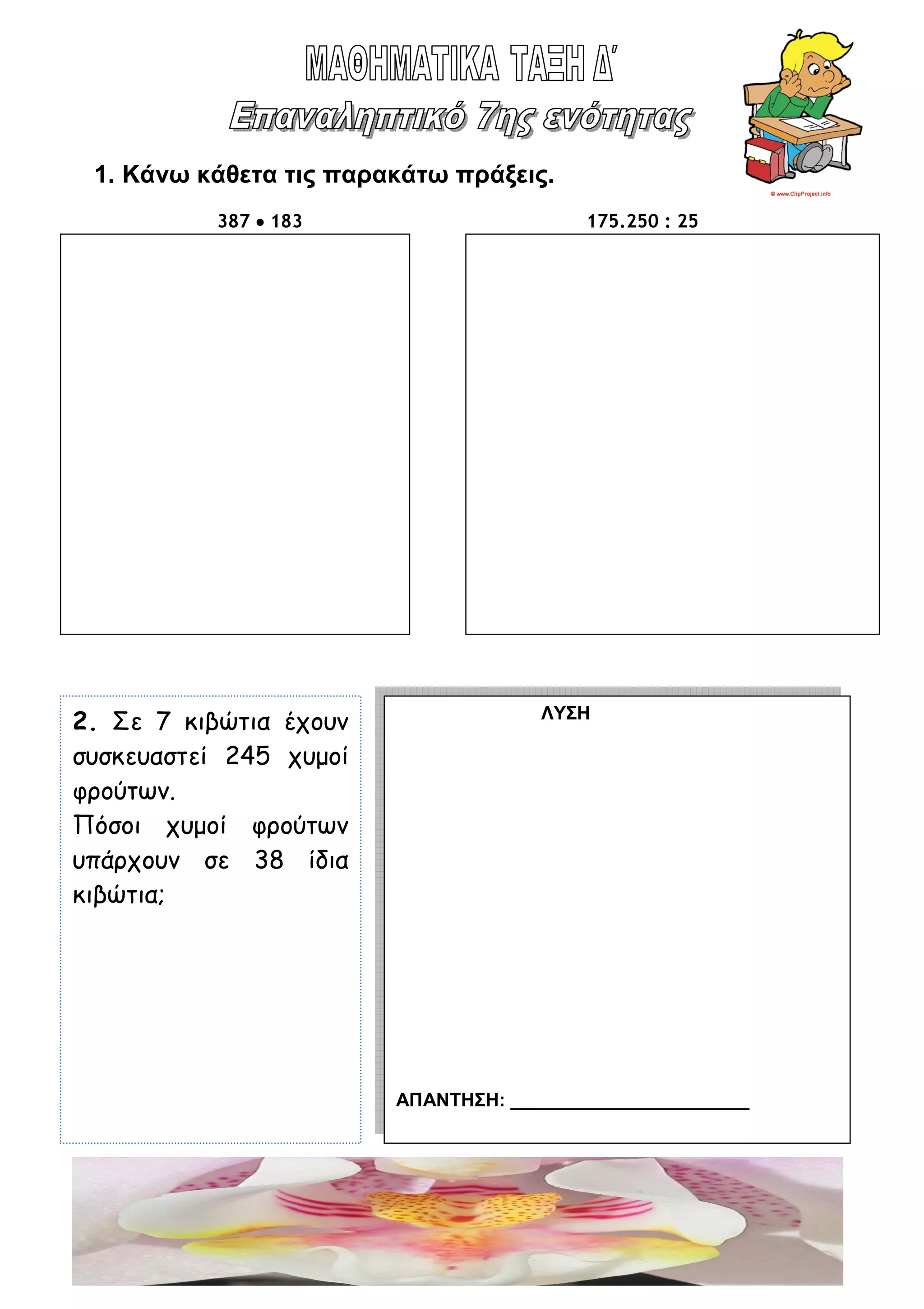 τις παρακάτω πράξεις. 387 •••• 183 175.250 : 25 2. Σε 7 κιβώτια έχουν συσκευαστεί 245 χυµοί φρούτων. Πόσοι χυµοί φρούτων υπάρχουν σε 38 ίδια κιβώτια; ΛΥΣΗ ΑΠΑΝΤΗΣΗ: _______________________