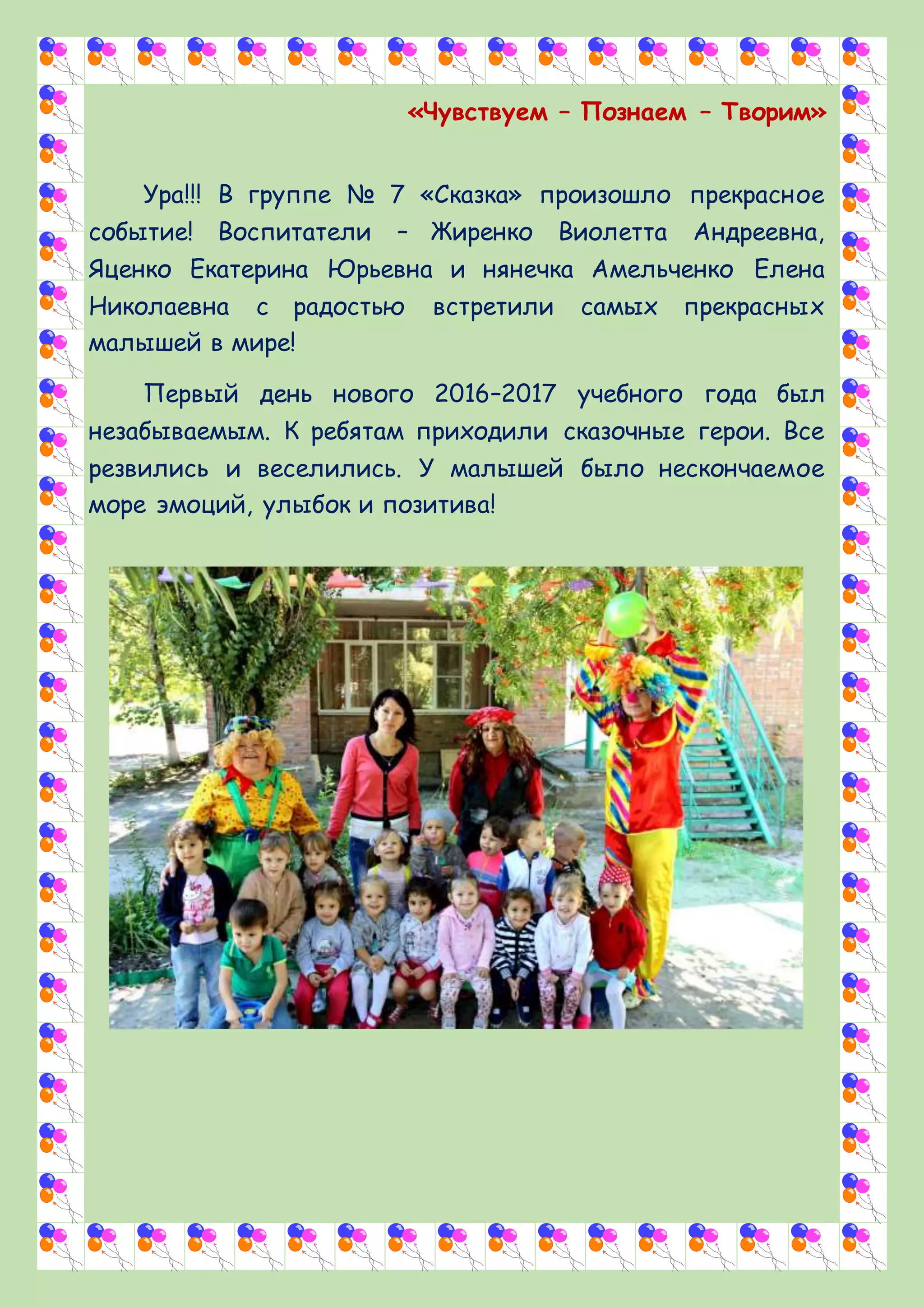В группе №7 «Сказка» детского сада №55 «Белоснежка» торжественно отпраздновали начало учебного года. Воспитатели и нянечка встретили малышей с участием сказочных героев, что создало атмосферу веселья и радости. Дети активно участвуют в занятиях и проявляют дружеские отношения друг к другу.