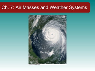 This chapter discusses air masses and weather systems. It describes the major air masses that affect weather in different regions, including maritime tropical (mT), continental polar (cP), and continental arctic (cA). Fronts are boundaries between differing air masses, such as cold fronts and warm fronts. Mid-latitude cyclones form in zones of clash between polar and subtropical air masses, bringing variable weather. Other atmospheric disturbances discussed include hurricanes, thunderstorms, tornadoes, blizzards, and tropical waves. Modern weather forecasting utilizes Doppler radar, satellites, and high-speed computing.