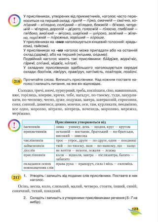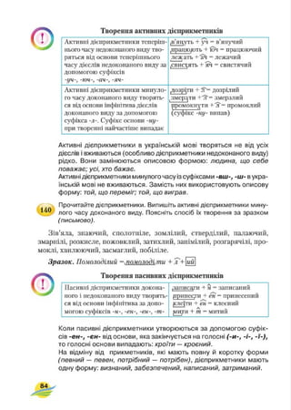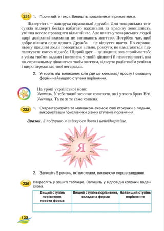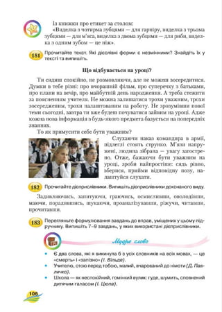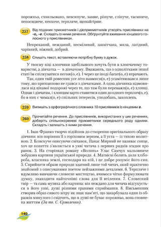 2. До якоїформи дієслова належать виділені слова? Визначте рід, число, дієвідміну цих дієслів. 3. Визначте синтаксичну роль дієслів у другій строфі вірша. Прочитайте текст. Складіть речення (3–4) зі словами висловити та виразити. Виисловити — вииразити Дозвольте висловити співчуття... У цій фразі дієслово висло вити вжито правильно. Воно поєднується також з іменниками надія, вдячність, припущення, схвалення. Висловлюють думку, пропозицію, міркування, ідею тощо. Уживати дієслова виражати, виразити замість висловлювати, висловити — неправильно. 1. Прочитайте текст. Випишіть дієприслівники. Любов до себе передбачає наявність різних компонентів. Наприк лад, люблячи себе, ти маєш правильно їсти. Дбаючи про своє здоров’я, думаєш про те, як твоє життя вплине на життя інших. Так, лежачи протягом двох місяців у лікарні, я точно знала, що це абсолютно виби ло з колії мою маму. Вона сиділа тут, у Києві, зі мною та дітьми, зали шивши всі свої робочі справи в Яремчому. Хочу сказати, що коли ми не дбаємо про своє здоров’я, то чинимо дуже егоїстично, не замислю ючись, як переживають інші за втрату нами можливості виконувати елементарні функції. Наші хвороби, змушуючи страждати рідних, порушують їхній звичний ритм життя (За І. Карпою). 2. Зауважте, що всі дієприслівники мають суфікси ачи , ячи , чи , вши . Перелічені суфікси притаманні тільки цій формі дієслова. Підкресліть суфікси у виписаних дієприслівниках. 1. Спишіть текст, поставивши дієслова в дужках у потрібну форму. «Скільки людей — стільки й характерів», — часто (повторювати) ми. І це справді так, двох однакових людей не (знайти). Навіть близнюки, яких не (могти) (розрізнити) з першого погляду, (виявлятися) зовсім різними людьми. Люди (мати) різні системи цінностей, захоплення, принципи і світогляд, по різному (реагувати) на події. Характер людини (зумовлювати) її вчинки, з яких і (складати) життя. 2. Визначте число, особу, дієвідміну дієслів. 33 52 53 54