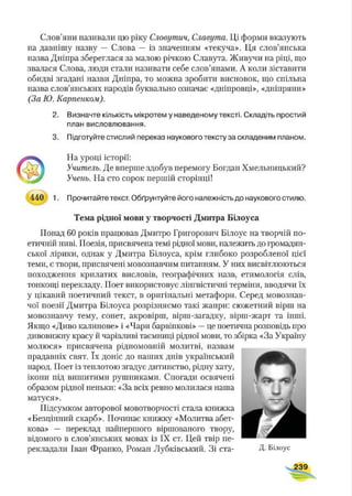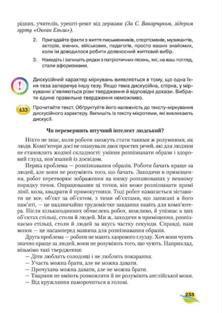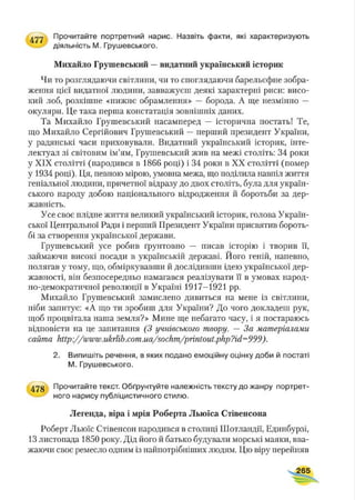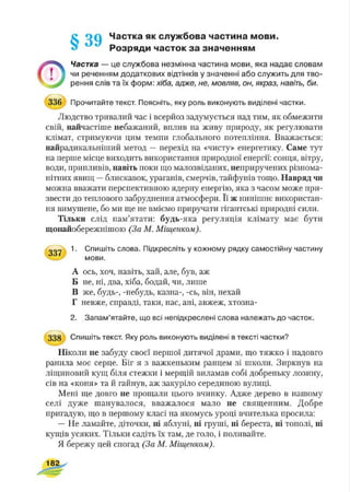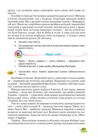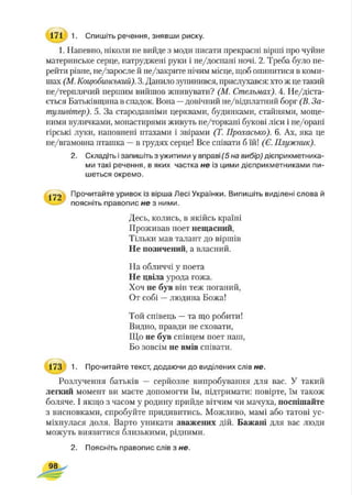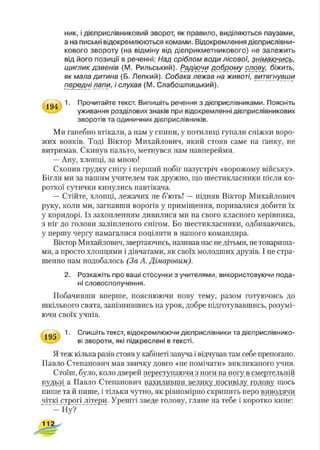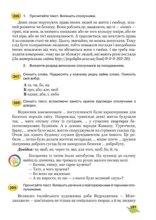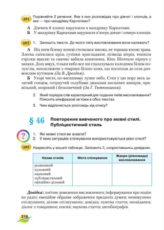 1. Спишіть текст,утворюючи форми умовного способу від дієслів, поданих у дужках. Ви все ще не знаєте, чим зайнятися у вільний час? Ну що ж — спор тивна секція, літературний гурток, театральна студія, художня школа — вибір занять неабиякий! Але є серед них одне — надзвичайно привабли ве, і я (хотіти) вам його порекомендувати: це бальні та спортивні танці. Ось те, що однозначно варто (бути) спробувати! Елегантність рухів і зву ки музики зачаровують усіх. Бальні та спортивні танці — це не тільки надзвичайно гарне, а й дуже корисне для здоров’я захоплення. Якщо ви (захопитися) цим видом спорту, то у вас (збільшитися) фізична витривалість, (поліпшитися) робота дихальної, опорно рухової та серцево судинної систем. Танці (допомагати) вам позбутися страхів, комплексів і невпевненос ті в собі, а також (підняти) самооцінку. Танці навчають жити в соціумі, спілкуватися з іншими людьми! 2. Визначте, до якого стилю мови належить текст. Доведіть свою думку (усно). Стоматолог запитує в чотирирічної Іринки: — А ти знаєш, які бактерії живуть у тебе на зубах? — Ні, я з ними не знайома. 1. Прочитайте текст. Від виділених дієслів утворіть і запишіть осо бові форми дійсного способу (в однині й множині). ...Довбуш приймав до себе не всіх, а тільки найкращих і найдужчих, що мали і розум, і силу, були відваж ними. Робив Олекса так: з високої гори спускав колесо, а внизу стояли люди й чекали, щоб показати свою вправність. Якщо хто на ходу перестрибував те колесо, то той вважався сміливцем. 2. Розгляньте скульптурне зображення А. Скиби «Довбуш». Пригадайте легенду про Олексу Дов буша. Які риси характеру Довбуша відтворив скульптор? 1. Прочитайте уривок із повісті «Захар Беркут». Перекажіть. І справді, місце було незвичайне, дике. Потік був вузький, може, на три сажні, не більше, завширшки, і так гладко прорізаний рвучою гір 56 92 93 94